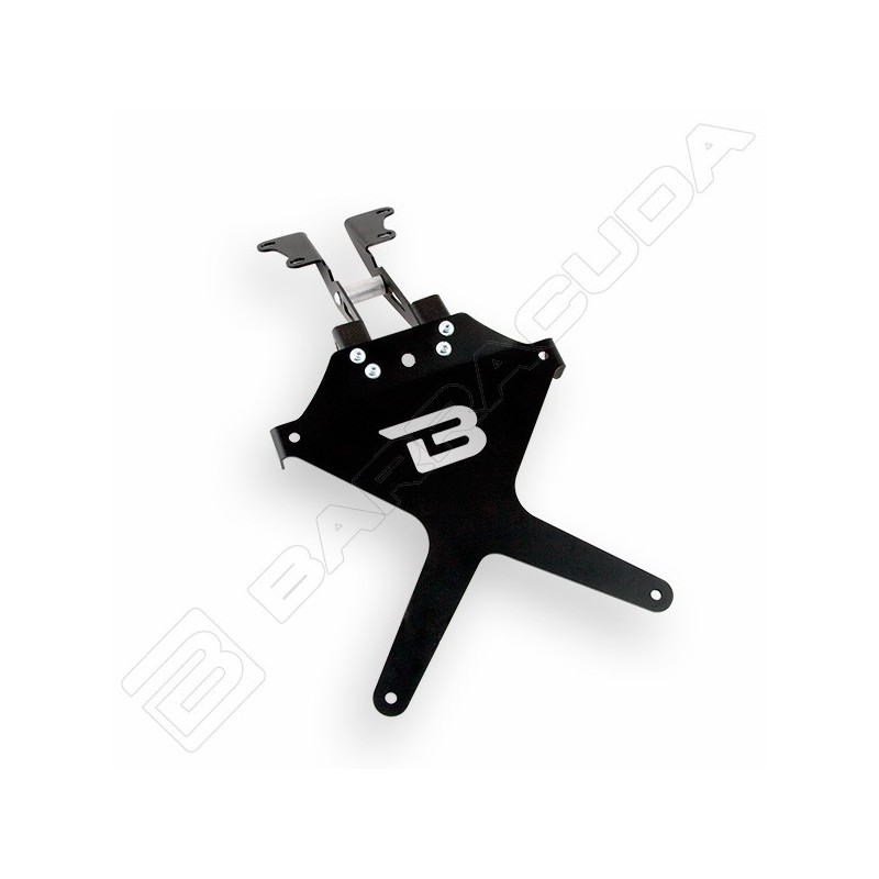 Il portatarga reclinabile è realizzato in alluminio anodizzato nero + snodo in acciaio