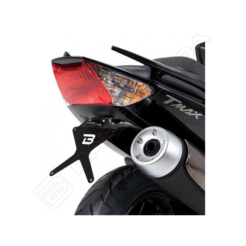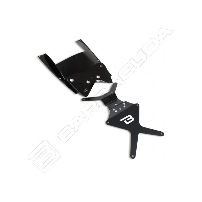 Il portatarga reclinabile è realizzato in alluminio anodizzato nero + snodo in acciaio