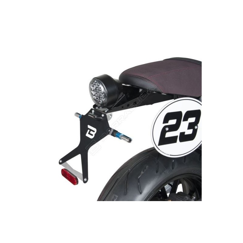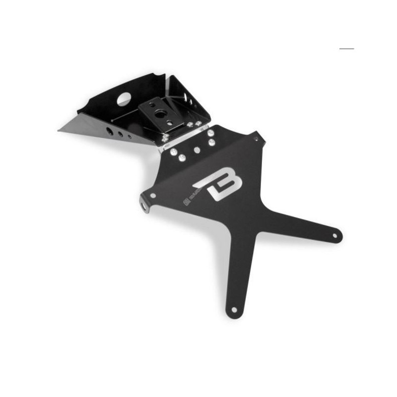Il portatarga reclinabile è realizzato in alluminio anodizzato nero + snodo in acciaio