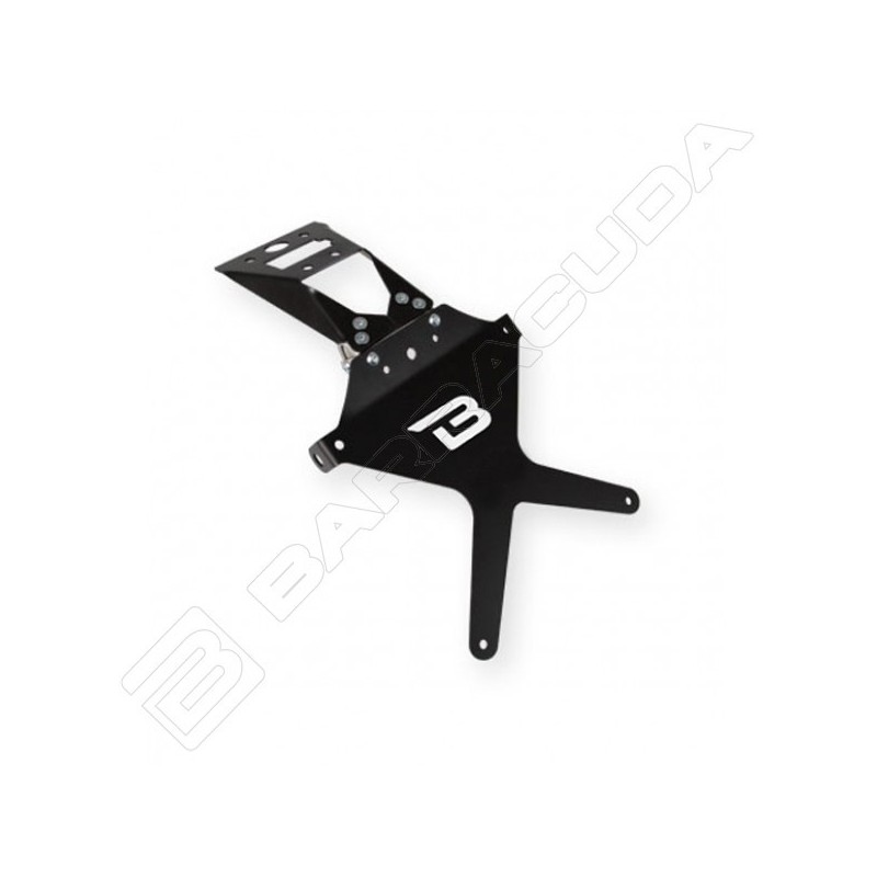 Il portatarga reclinabile è realizzato in alluminio anodizzato nero + snodo in acciaio