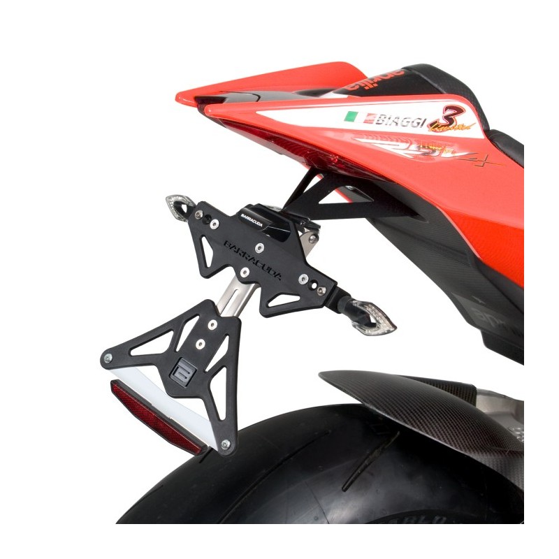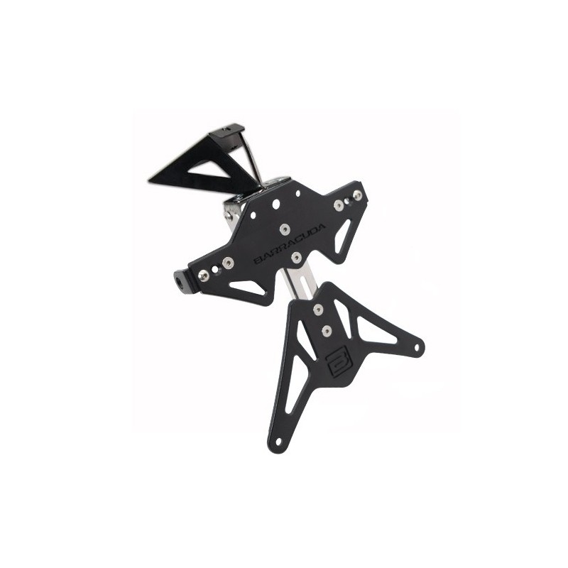 Il portatarga reclinabile è realizzato in alluminio anodizzato nero + snodo in acciaio