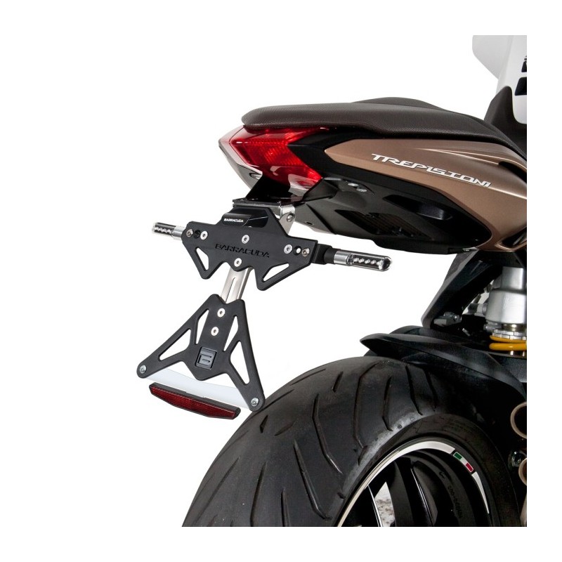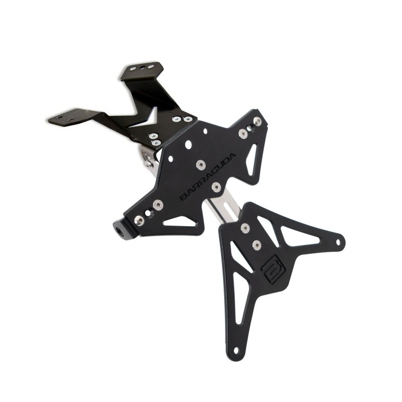 Il portatarga reclinabile è realizzato in alluminio anodizzato nero + snodo in acciaio