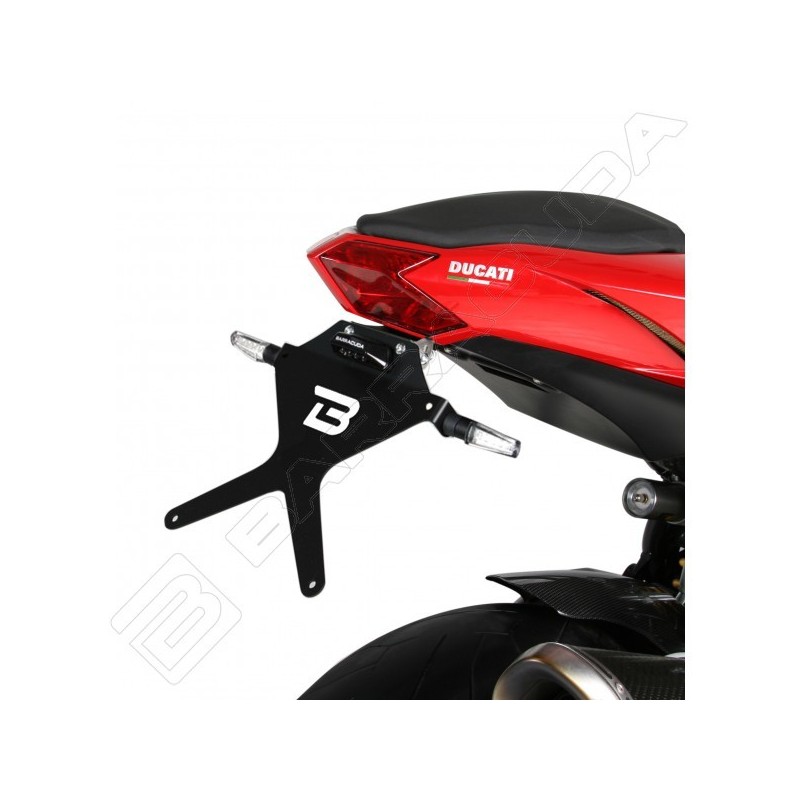 Il portatarga reclinabile è realizzato in alluminio anodizzato nero + snodo in acciaio
