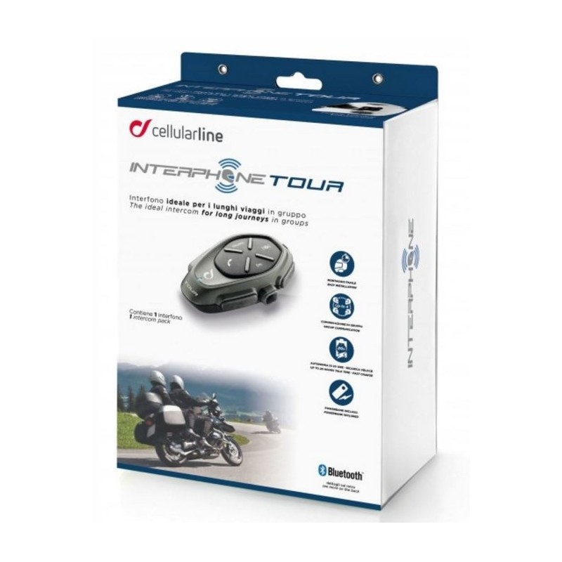 Interphone Tour è in grado di far comunicare fino a quattro motociclisti entro una distanza massima di 1,5 km. È compatibile con tutti gli smartphone dotati di tecnologia Bluetooth® e consente di ricevere ed effettuare chiamate, ascoltare musica e seguire le indicazione del navigatore sul percorso.
