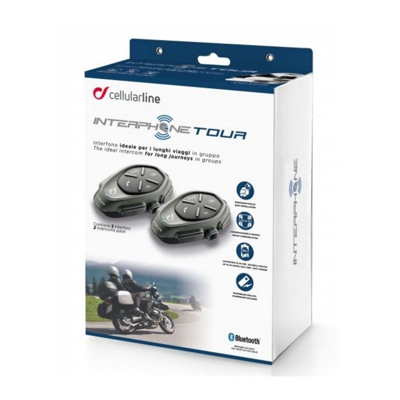 Interphone Tour è in grado di far comunicare fino a quattro motociclisti entro una distanza massima di 1,5 km. È compatibile con tutti gli smartphone dotati di tecnologia Bluetooth® e consente di ricevere ed effettuare chiamate, ascoltare musica e seguire le indicazione del navigatore sul percorso.