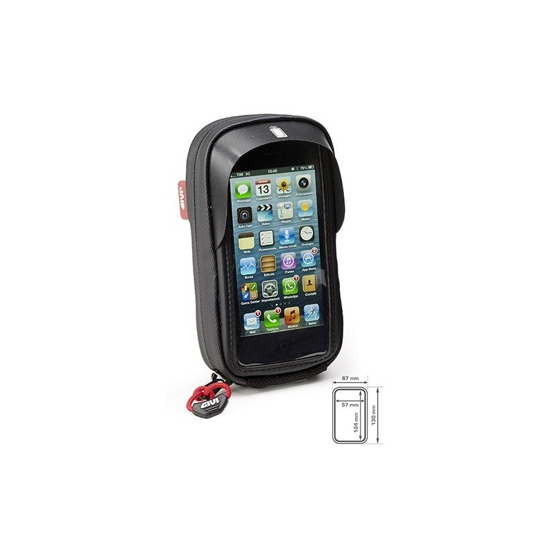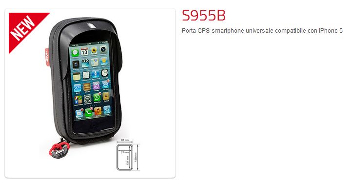 Compatibile con i-phone 5 (scooter, moto e biciclette) Dotazioni: - Cinghia di sicurezza e copertura impermeabile compresi nella confezione. - Superficie touch sensible trasparente. - Aletta parasole. - Apertura inferiore per permettere l'alimentazione del device. Compatibile con GIVI power connection. - Cerniere con copertura anti-acqua.