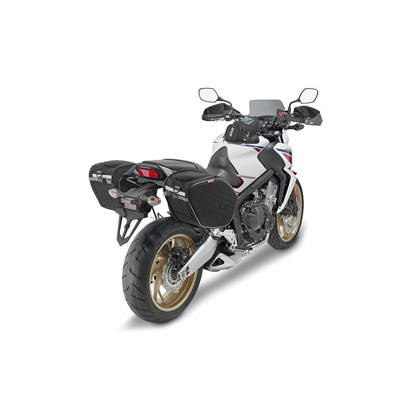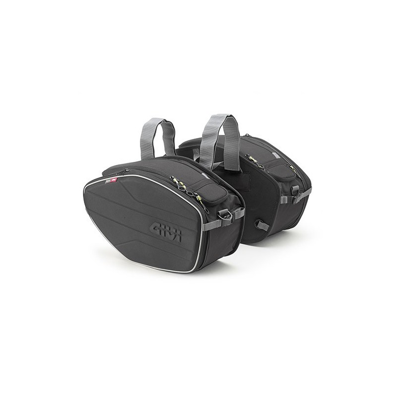 Coppia di borse laterali realizzate in 600D PU, la parte frontale termoformata in EVA e rivestita di poliestere a disegno esagonale per aumentare la rigidità e la stabilità. Dotata di un sistema di attacco rapido per mezzo di cinghie con velcro e cinghia centrale di sicurezza