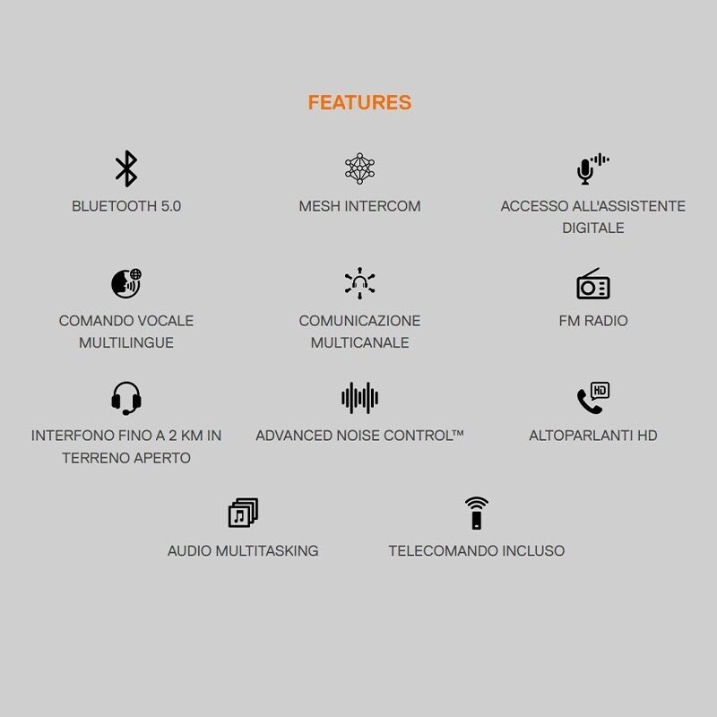 L'unità principale, perfettamente integrata sul retro del casco, include una batteria ad alte prestazioni in grado di garantire un'autonomia di conversazione fino a 12 ore. Il nuovo telecomando, posto sul lato del casco, è stato progettato ergonomicamente per garantire la massima usabilità con i guanti.